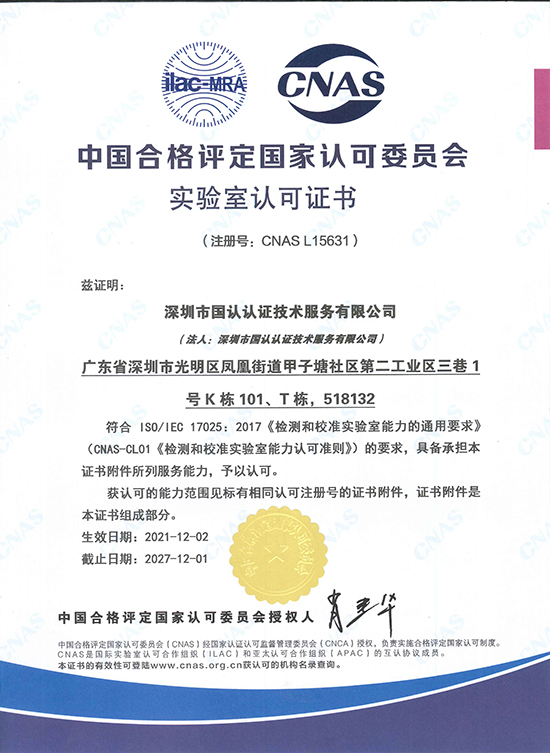熱烈祝賀國認獲得了中國合格評定認可委員會(CNAS)編號:CNAS L15631證書。CNAS是中國合格評定國家認可委員會的英文縮寫(China Nati...