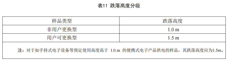 8.5 跌落(電池組) | 跌落高度的分級由按照容量區分,更新為是否為用戶可更換型區分,如下: |
