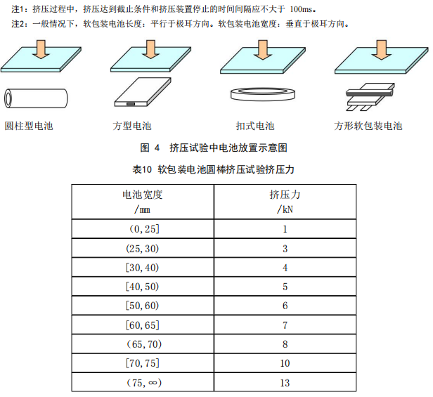 明確了擠壓速度為0.1mm/s,停止試臉的條件由“壓力達到最大值”更新為“壓力達到最大值或電池的電壓下降三分之一”,對于長度不小于 25mm的軟包裝電池,增加了放置鋼制半圓柱的要求,且擠壓力根據電池寬度的不同而不同。如下: | |
